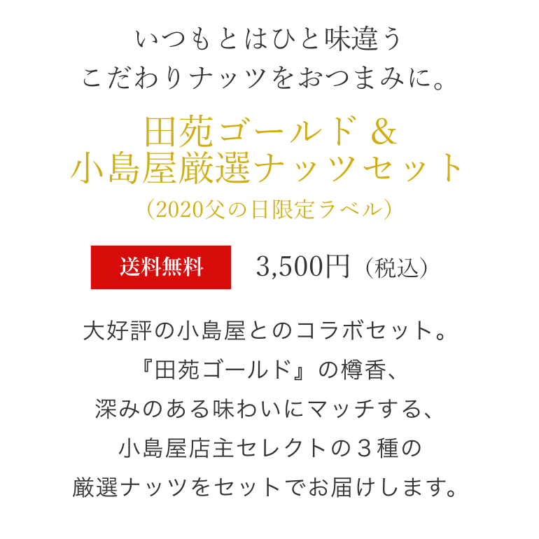 父の日限定ラベルの『田苑ゴールド』に、小島屋セレクトの3種のナッツをセットでお届け♪
